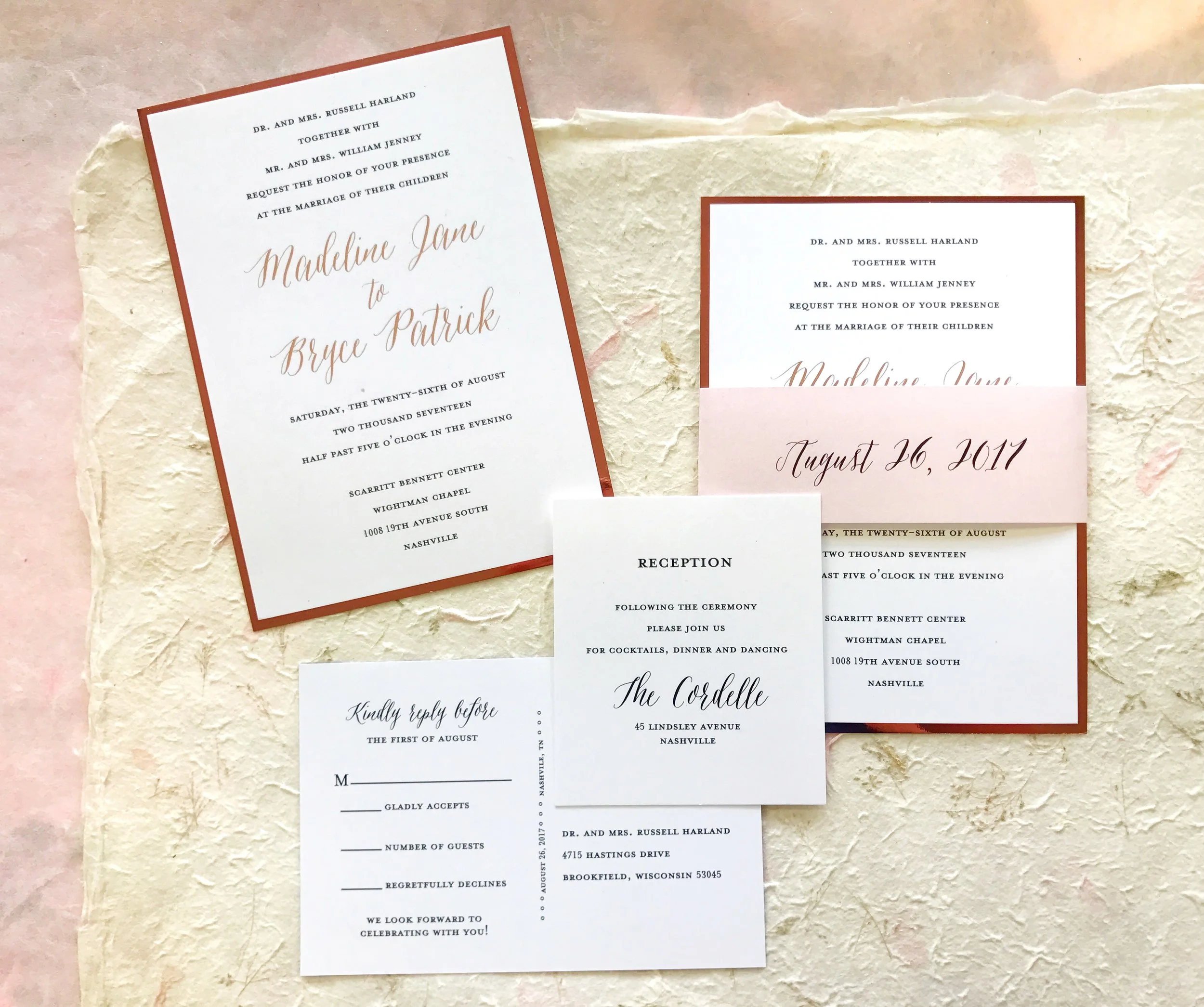 - The suite to the left is just as darling as the Nashville bride-to-be. Simple yet stunning using a copper foil backer, this bride really got creative and chose to add a belly band around the rose gold foiled names.